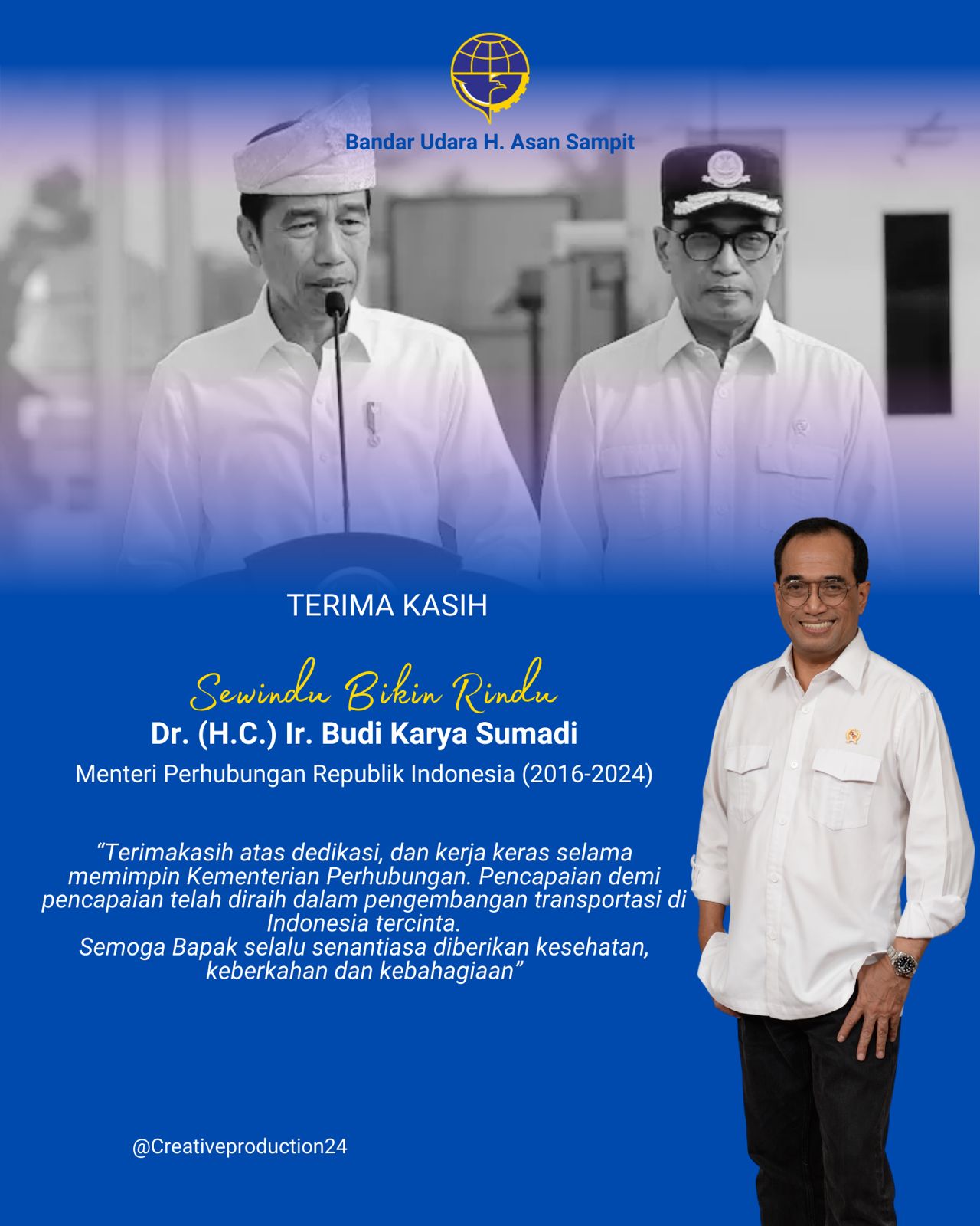 Seluruh keluarga besar Bandara H. Asan Sampit dan masyarakat Kotawaringin Timur mengucapkan terima kasih yang sebesar-besarnya kepada Bapak Budi Karya Sumadi atas pengabdian dan dedikasi beliau sebagai Menteri Perhubungan Republik Indonesia selama periode 2016-2024.