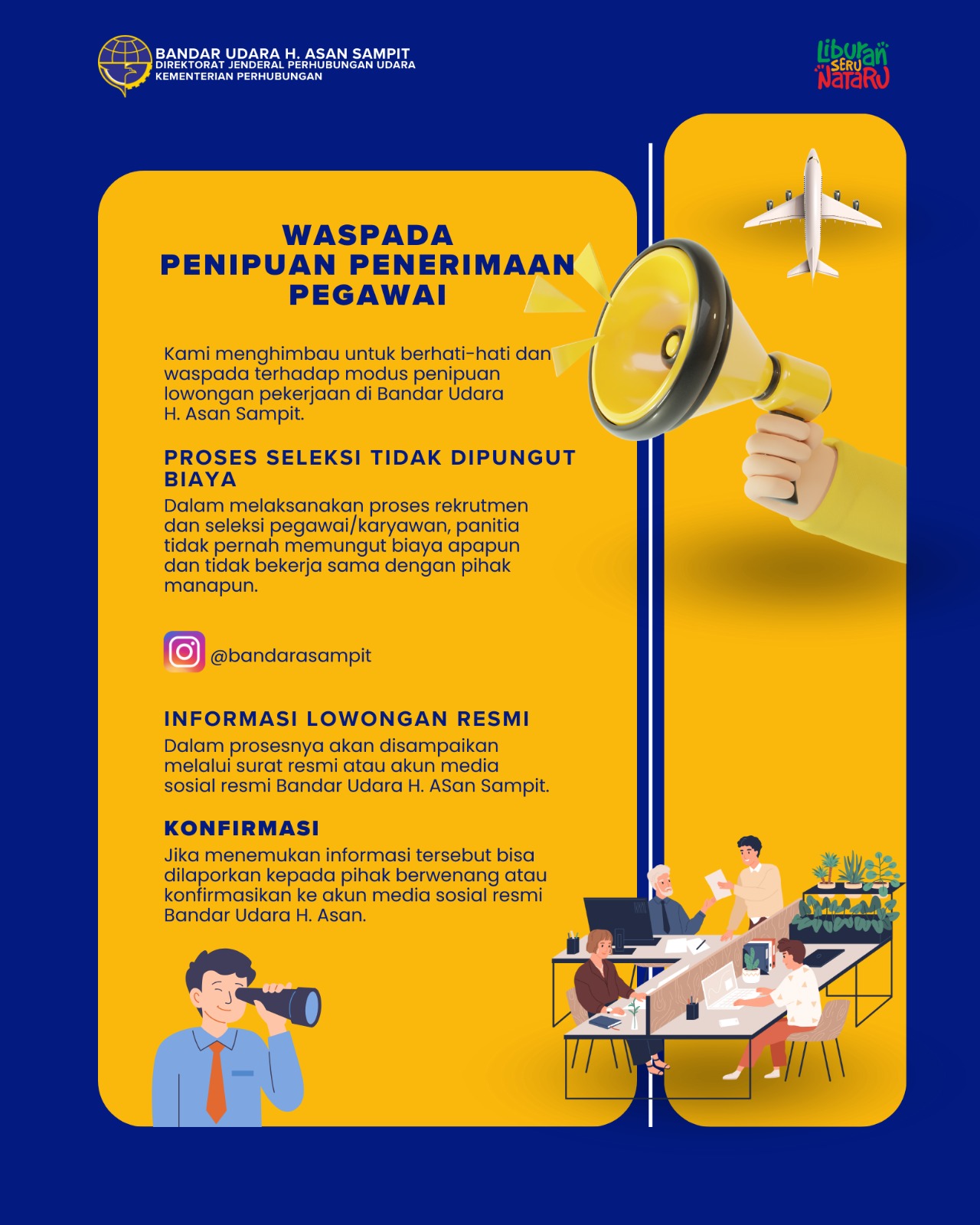Kepada seluruh masyarakat, kami menghimbau untuk tetap waspada terhadap modus penipuan lowongan pekerjaan yang mengatasnamakan Bandar Udara H. Asan Sampit.