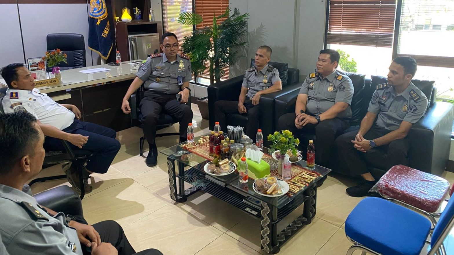 Kedatangan rombongan disambut langsung oleh Kepala Kantor UPBU H. Asan Sampit, Abdul Haris, di ruang kerjanya. Suasana pertemuan berlangsung hangat dan penuh semangat kerja sama, mencerminkan komitmen bersama dalam meningkatkan koordinasi antarinstansi, khususnya dalam hal pelayanan keimigrasian dan pengawasan terhadap penumpang lintas negara yang menggunakan moda transportasi udara melalui Bandara H. Asan Sampit.