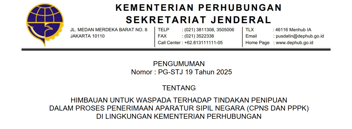 - Segala informasi penerimaan CASN hanya disampaikan melalui kanal resmi Kementerian Perhubungan atau BKN.