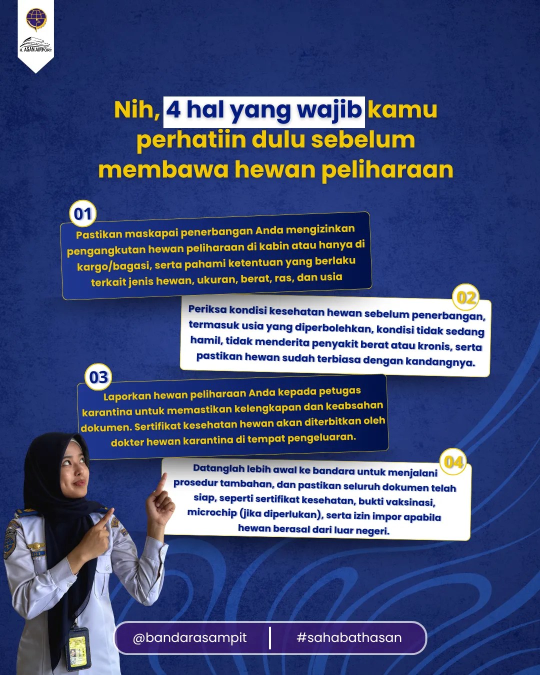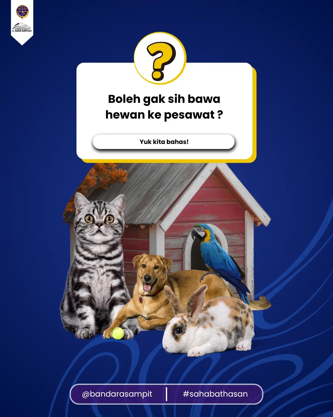 SAMPIT — #SahabatHAsan, berencana bepergian menggunakan pesawat bersama hewan peliharaan? Pastikan Anda telah memahami aturan dan prosedur yang berlaku agar perjalanan si pet kesayangan tetap aman, nyaman, dan sesuai ketentuan penerbangan.
